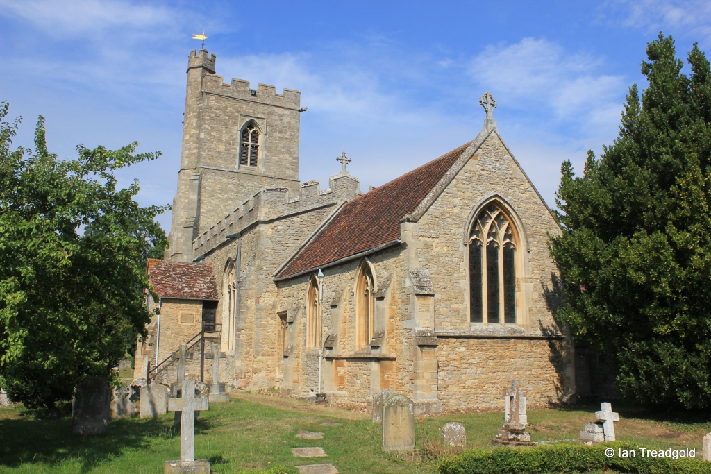 The church has a chancel, north aisle and chapel on the north side with two-storey porches on both the north and south sides along with a west tower and stair turret.
